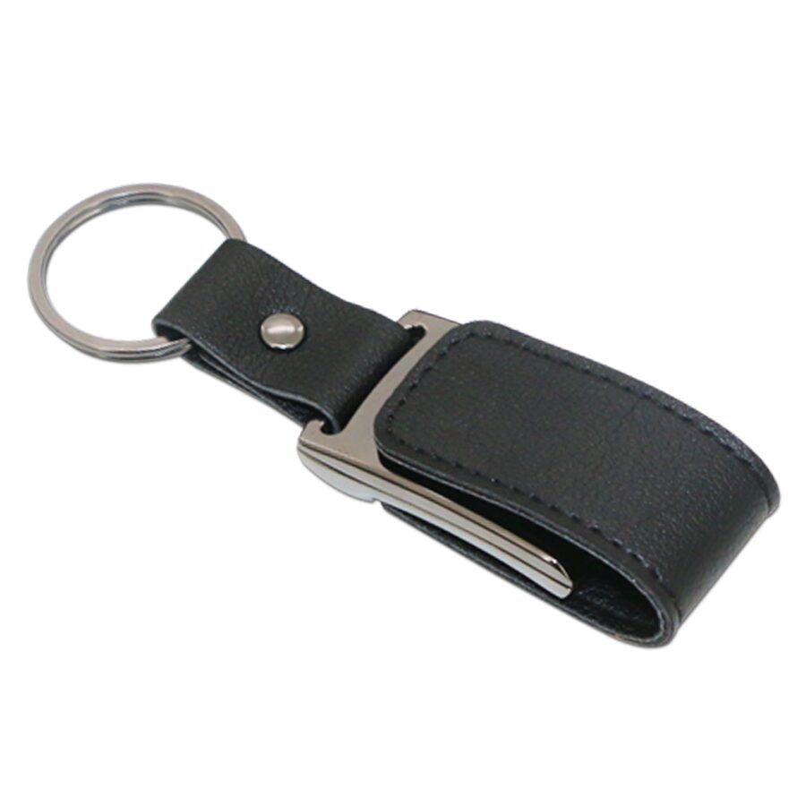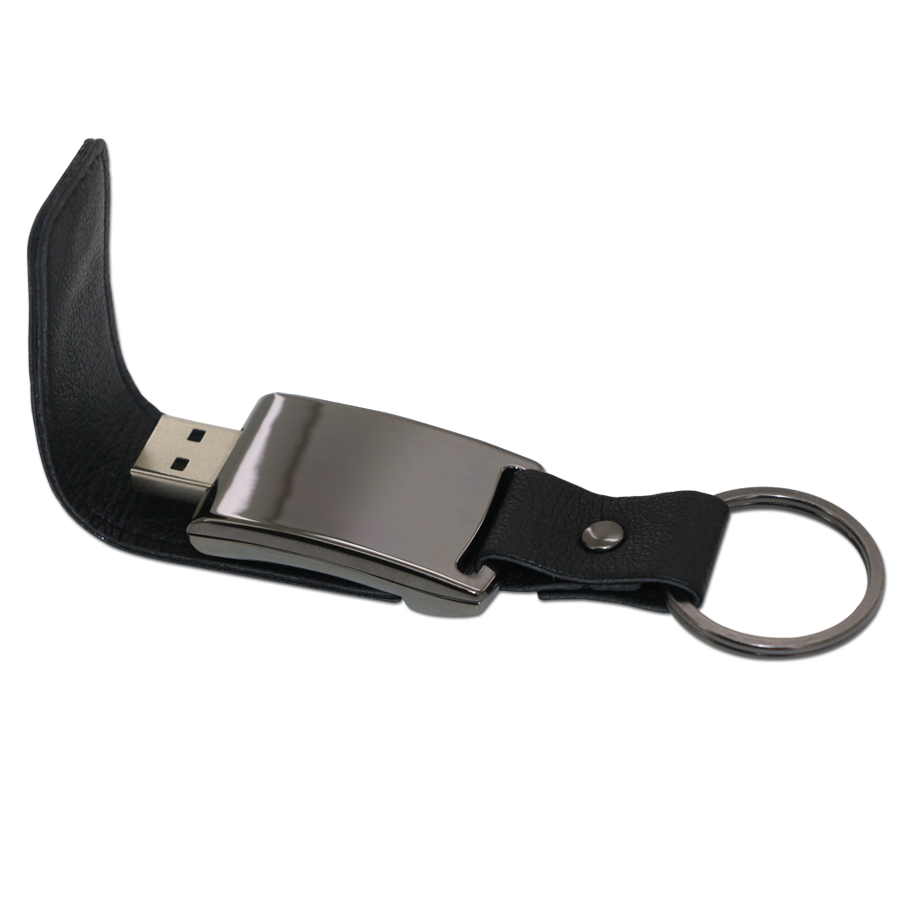 - USB 32 GB en smilicuir noir et métal avec un anneau pour porte-clés