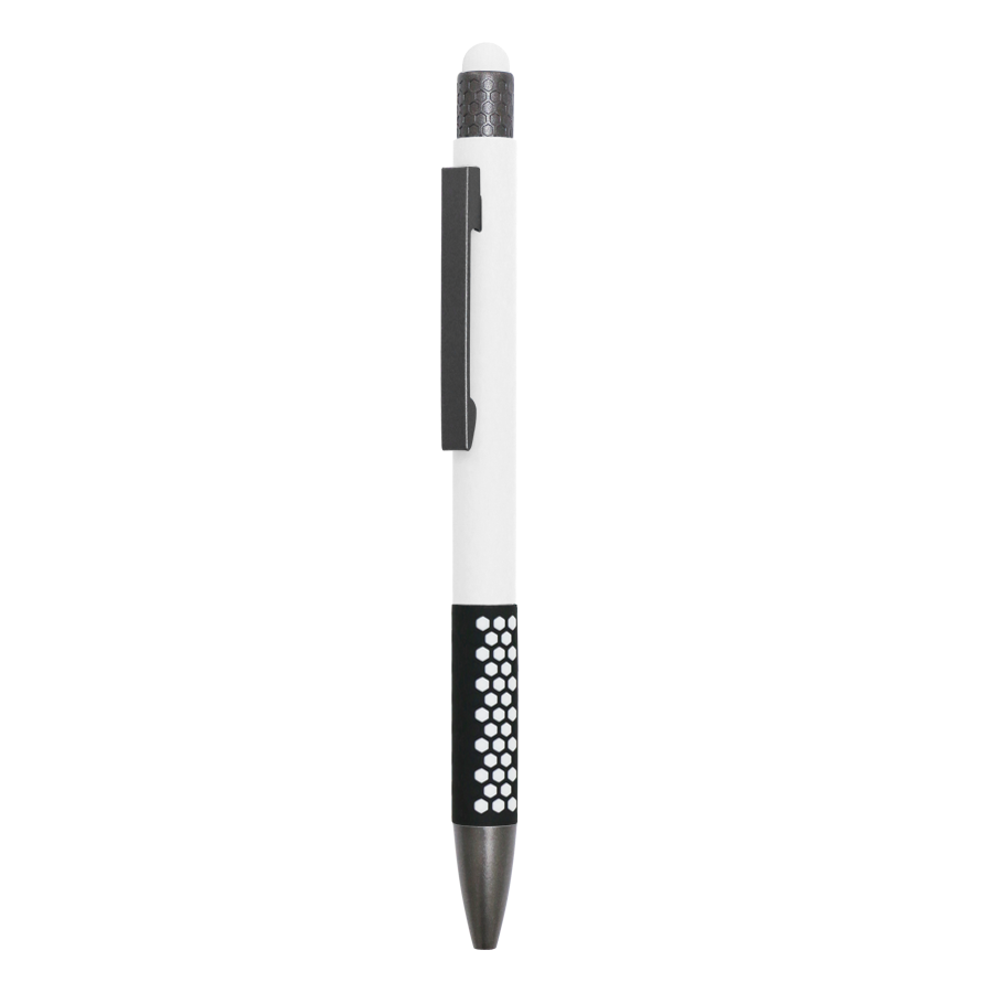 Stylo tactile à bille en aluminium finition soft-touch avec motif nid d’abeilles et attributs en gris
